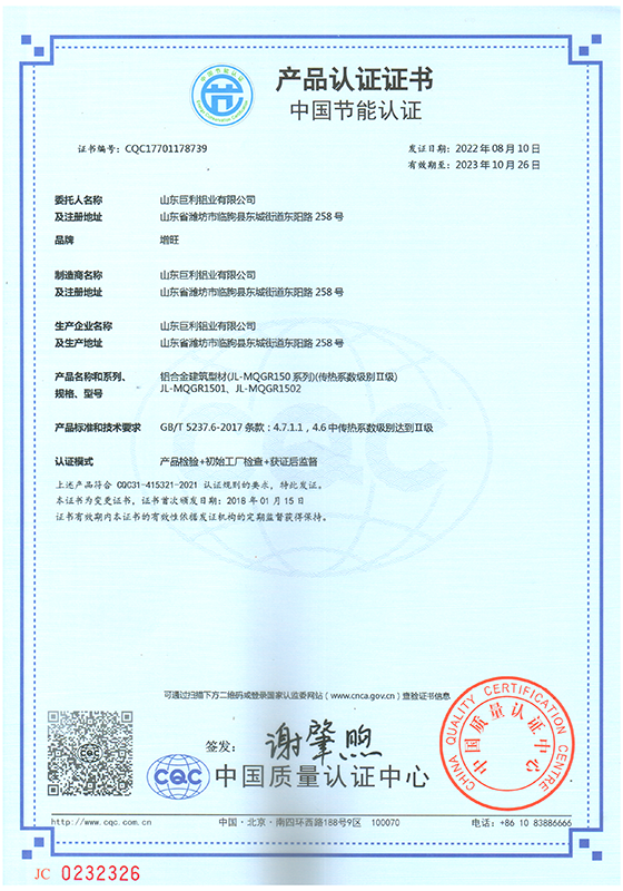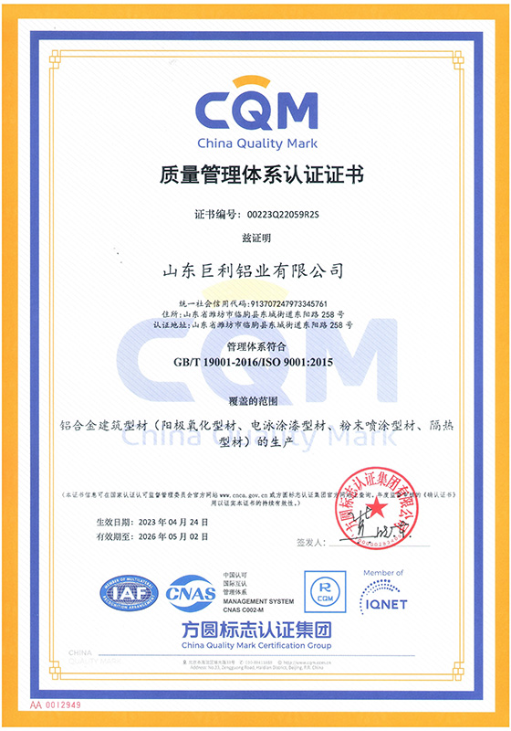山東巨利鋁業(yè)有限公司是大型專業(yè)化鋁合金門窗、幕墻建筑型材生產(chǎn)企業(yè)。公司座落于中國江北最大鋁合金建筑型材生產(chǎn)、銷售集散地,被稱為“中國鋁業(yè)之都”的臨朐,地處山東半島中部,濰坊市西南部,沂山北麓,公司西臨彌河,東靠長深高速,北接濟青高速,地理位置優(yōu)越,交通十分便利。公司占地總面積18.5萬平方米,擁有國際先進水平的擠壓、陽極氧化、電泳涂漆、粉末噴涂、氟碳噴涂、木紋轉(zhuǎn)印、隔熱斷橋等系列生產(chǎn)線,年生產(chǎn)節(jié)能環(huán)保鋁型材7萬噸。公司先后通過IS09001質(zhì)量管理體系認證、ISO14001環(huán)境管理體系認證、0HSAS45001職業(yè)健康安全管理體系認證、IATF16949汽車行業(yè)質(zhì)量管理體系認證和中國綠色建材產(chǎn)品認證。公司先后榮獲山東省專精特新中小企業(yè)、山東省高新技術(shù)企業(yè)、山東省科技型中小企業(yè)榮譽稱號。“客戶的滿意,巨利的追求”。不斷的改進和完善質(zhì)量管理,不斷的提高售后服務(wù)水平,持續(xù)向客戶提供一流的產(chǎn)品和一流的服務(wù),是我們巨利人孜孜以求的永恒目標,我們愿與廣大業(yè)務(wù)同仁共同努力,共創(chuàng)雙贏,不斷發(fā)展,走向更加輝煌的明天。